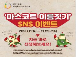 엑스포 ‘마스코트 이름 짓기’ SNS 이벤트는 지난 16일부터 11월 23일까지 8일간 진행되며, 참여방법은 엑스포 공식 페이스북과 인스타그램에서 ‘팔로우’ 및 ‘좋아요’를 누르고 이벤트 페이지에 마스코트와 어울리는 이름과 작명이유를 댓글로 남기면 된다.