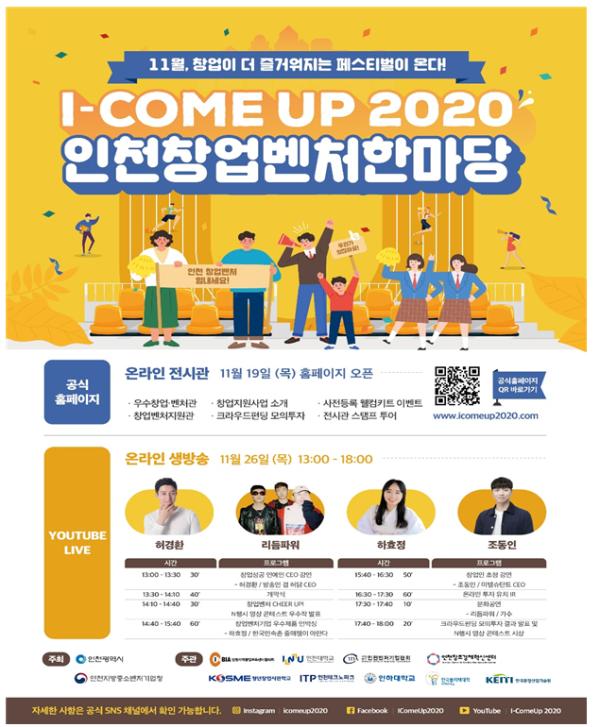 자세한 내용은 I-ComeUp 2020 인천창업벤처한마당 홈페이지와 인천광역시청 홈페이지 새소식에서 확인할 수 있다.