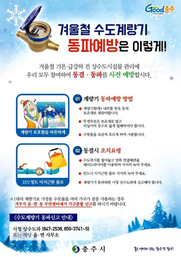 한편 수도 배관과 계량기 등의 동파사고 발생 시에는 충주시 상수도과 (☏847-2538, 850-3741~5)로 연락하면 된다.