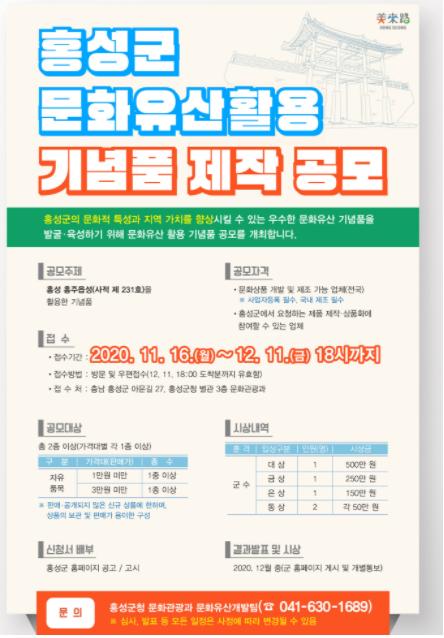 홍성군이 코로나19의 확산으로 현장방문이 어려워짐에 따라 자료조사 및 제품 제작 기간의 확보를 위해 ‘홍성군 문화유산활용 기념품 제작 공모전’의 접수 마감일을 12월 11일까지 연장했다.