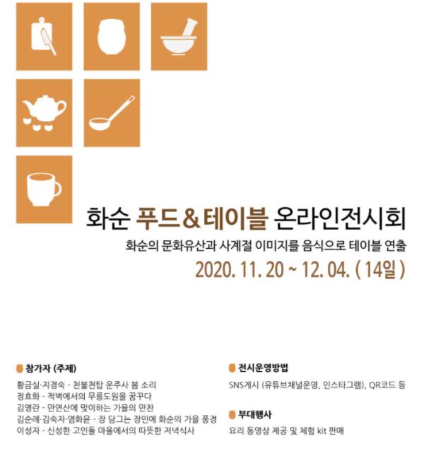 화순군이 지역 농산물 소비를 촉진하기 위해 지역의 문화유산과 사계절, 농·특산물을 접목한 먹거리를 소개하는 ‘화순 푸드&테이블 온라인 전시회’를 연다.