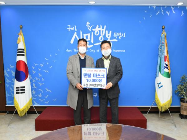 구리시는 지난 16일 시청 민원상담실에서 ㈜비젼정보통신 문병국 대표 등이 참여한 가운데, 후원사인 ㈜비젼정보통신과의 코로나19 재확산 방지를 위한 ‘덴탈 마스크 10,000장 전달식’ 을 진행했다고 밝혔다.