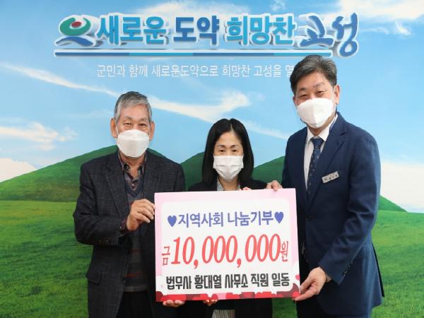 법무사 황대열 사무소(대표 황대열) 직원 일동은 11월 17일 고성군청을 방문하여 어려운 이웃을 위해 성금 1,000만 원을 전달했다.