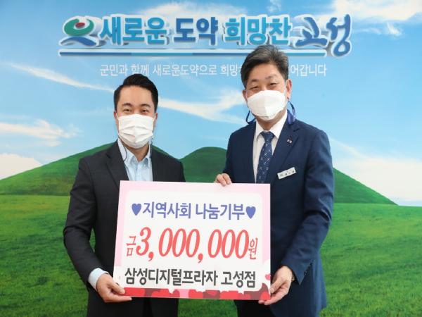 삼성디지털프라자 고성점(지점장 이경우)은 11월 17일 고성군청을 방문하여 어려운 이웃을 위해 성금 300만 원을 전달했다.