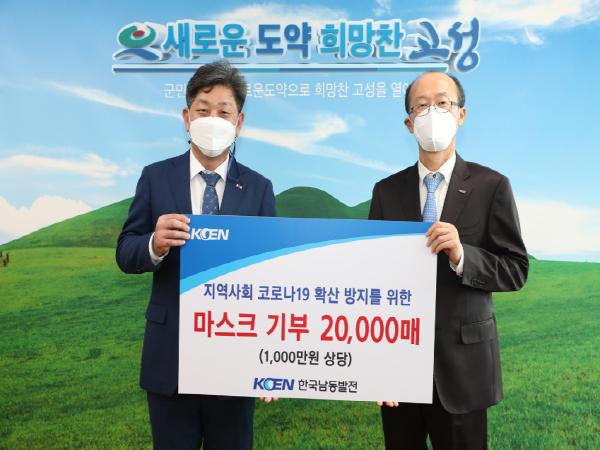 한국남동발전 ㈜삼천포발전본부(본부장 임다두)은 11월 17일 고성군청을 방문하여 코로나19 대응을 위해 마스크 2만장(1,000만 원 상당)을 전달했다.