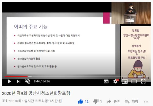 지난 11월 15일 양산시청소년회관과 양산시청소년참여위원회 주관으로 관내 청소년정책에 청소년의 목소리를 반영하는 기회의 장을 마련하고자 2020년 제9회 양산시청소년희망포럼이 [전지적청소년시점]이라는 부제로 열렸다.
