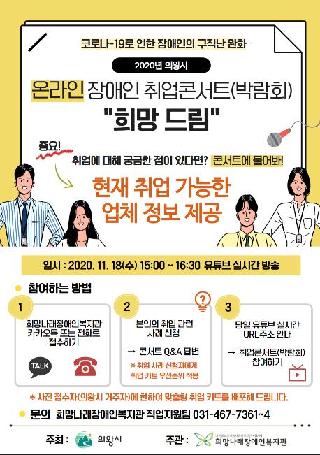 의왕시는 18일 희망나래장애인복지관 주관으로 코로나19로 인해 취업 사각지대에 놓인 구직장애인을 위한‘희망드림’온라인 장애인 취업콘서트를 개최한다.