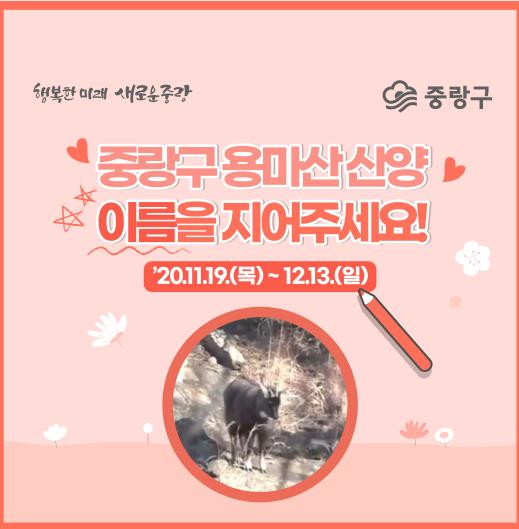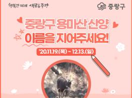 구는 산양을 알리고 용마산 자연생태환경 보전과 자연에 대한 구민의 관심을 높이기 위해 오는 19일부터 12월 13일까지 산양 이름 짓기 SNS이벤트를 개최한다. ‘용마산에 서식중인 소중한 산양에게 어울리는 멋진 이름을 지어주세요’라는 제목으로 진행되는 이번 이벤트는 블로그, 페이스북, 인스타그램 등 SNS 6개 매체에서 동시에 진행되며 산양 이름 짓기에 참여한 구민 중 1등, 2등, 3등을 가려 중랑사랑상품권을 증정할 예정이다.