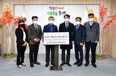중랑구는 17일 오전 10시 30분 4층 구청장실에서 두레이앤씨 주식회사(회장 백경태)로부터 2021 희망온돌 따뜻한 겨울나기 성품을 전달받았다고 밝혔다.