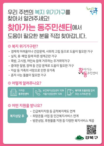 강북구가 겨울을 맞아 복지사각지대 위기가구를 내년 3월까지 집중적으로 발굴해 지원한다.