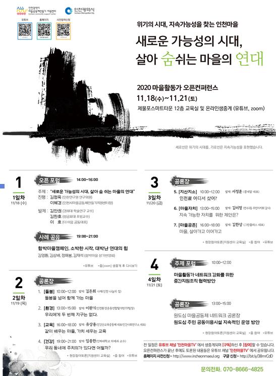 오픈컨퍼런스 참가접수는 인천시 마을공동체만들기 지원센터 홈페이지에서 신청 가능하며, 첫날 오픈포럼은 인천시 공식 유투브 채널, 컨퍼런스 전 과정은 ‘인천마을TV’(유투브)로 생중계된다.
