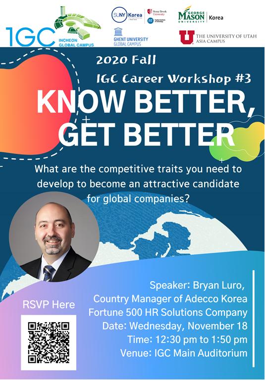 인천글로벌캠퍼스운영재단에서는 입주대학 재학생취업지원을 위해 11월 18(수) "2020 제4차 IGC 커리어 워크숍"을 인천글로벌캠퍼스 대강당에서 개최한다.