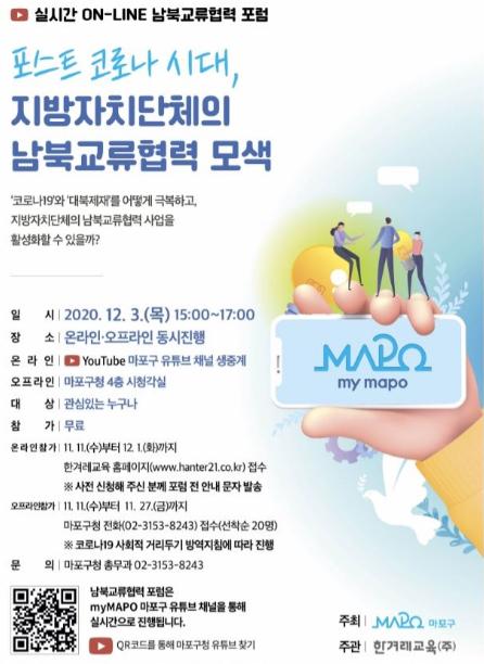 마포구가 포스트코로나 시대 지방자치단체의 남북교류 활성화 방안을 주제로 오는 12월 남북교류협력 포럼을 개최한다고 밝혔다.