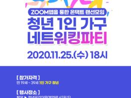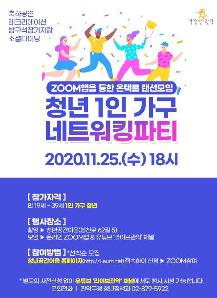 관악구가 오는 11월 25일(수) 오후 6시, ZOOM 앱과 유튜브 ‘라이브관악’채널을 통해 「청년 1인 가구 네트워킹 파티」를 개최한다고 밝혔다.