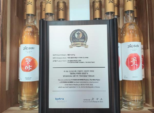 Kotra(대한무역투자진흥공사)에서 국·내외 우수 식품 발굴 및 시상을 통해 우수 상품의 성장을 지원하는‘제6회 SEOUL FOOD 2020(서울 국제 식품대전)’에서 힐링 분야 우수 상품으로 264청포도와인 ‘꽃’, ‘광야’제품이 선정되었다. 참가 업체 제품을 식품 분야별 전문 자문단이 4단계 심사를 통해 선정하는 까다로운 절차를 통과하며 가치를 인정받았다. 수상 특전으로 와인 병에 붙일 수 있는 인증 패치(3년간 사용 가능)와 각종 언론매체에 홍보 및 영상 제작 등의 혜택을 받아 향후 홍보효과에 많은 도움이 될 것으로 보인다.