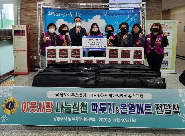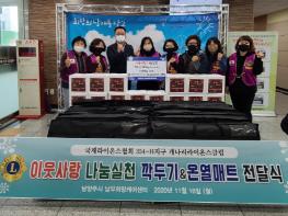 국제라이온스협회 354-H지구 개나리라이온스클럽(회장 오혜령)은 지난 16일 취약계층의 따뜻한 겨울나기를 돕고자 깍두기 240kg와 온열매트 13개를 남부희망케어센터(센터장 김기수)에 기탁했다.