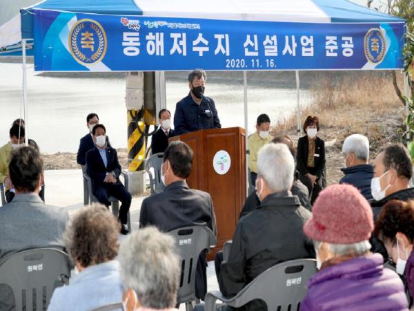 군 관계자는 “그동안 원북면 동해지구는 지하수가 부족하고 농업용수 공급시설이 없어 ‘가뭄피해 상습지역’으로 분류ㆍ관리됐으나, 이번 ‘동해저수지’ 준공으로 안정적인 농업용수 공급이 가능해졌다”고 말했다.
