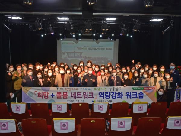 대구광역시 남구청은 지난 16일, 남구청소년창작센터 창공홀에서 “희망 돌봄 네트워크” 역량 강화 워크숍과 ‘함께하는 희망돌봄!“ 힐링 프로그램을 개최했다.