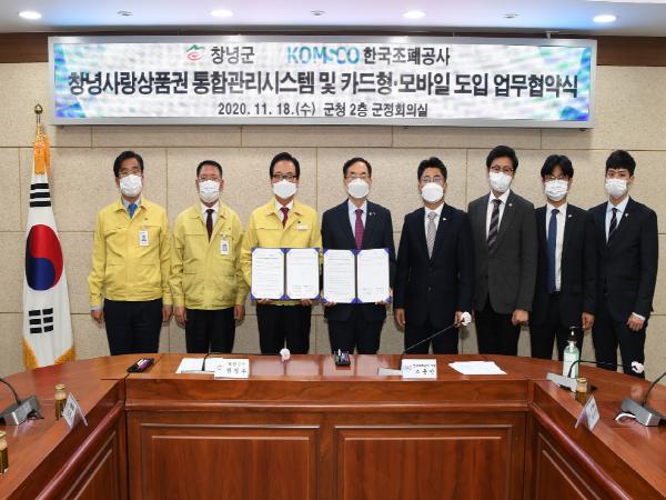 창녕군은 18일 군청 군정회의실에서 한국조폐공사(사장 조용만)와 창녕사랑상품권 모바일?카드 도입을 위한 업무협약을 체결했다.