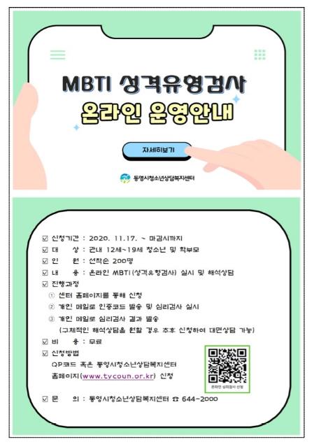 통영시청소년상담복지센터는 코로나19 장기화로 인해 심리적으로 지친 관내 12세~19세 청소년 및 학부모 200명을 대상으로 마음 건강 돌보기를 위한 온라인 MBTI(성격유형검사)를 무료로 운영하고 있다.