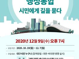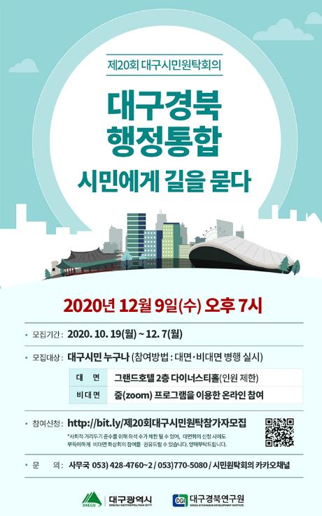 대구시는 12월 9일 오후 7시 그랜드호텔(다이너스티홀)에서 ‘대구경북 행정통합, 시민에게 길을 묻다’라는 주제로 제20회 대구시민원탁회의를 개최한다.