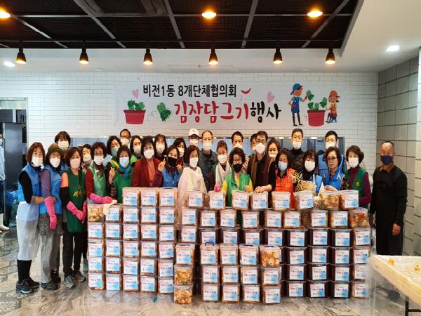 평택시 비전1동 8개단체협의회(협의회장 김진성)는 18일 비전1동행정복지센터에서 ‘사랑의 김장 담그기’ 행사를 개최했다.