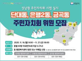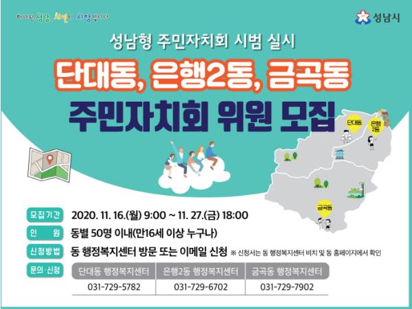 성남시는 단대동, 은행2동, 금곡동 3개 동 주민을 대상으로 16일부터 27일까지 주민자치회 위원 공개 모집에 나선다.