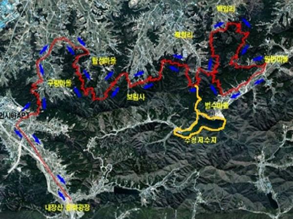 해당 코스는 사업비 6억원을 투입해 내장산 문화광장을 시작으로 북면 보림리와 칠보면 등 기존 임도를 활용한 코스 외에 수청저수지 일원이 추가된 코스다.