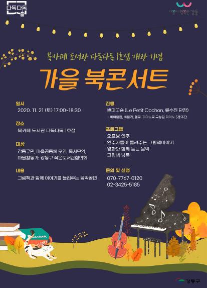 아울러, 가을 북콘서트는 코로나19 방역수칙을 준수하여 진행되며, 사전신청 접수 후 참여가능하다. 문의 및 접수는 북카페도서관 다독다독(☎070-7767-0120)으로 하면 된다.