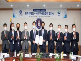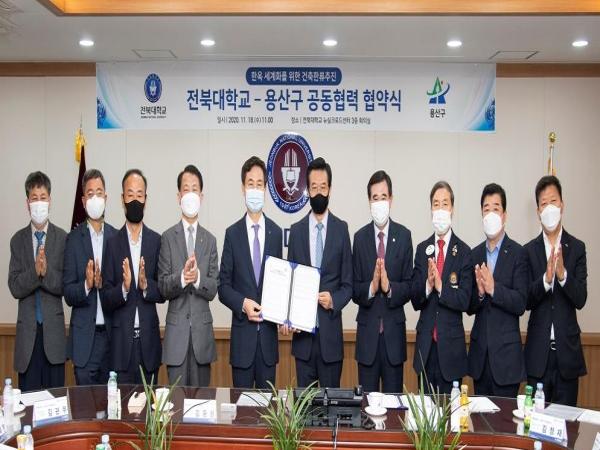 서울 용산구와 전북대학교가 18일 전북대학교 뉴실크로드관 3층 회의실에서 ‘한옥 세계화를 위한 건축한류 공동협력 업무협약’을 맺었다.