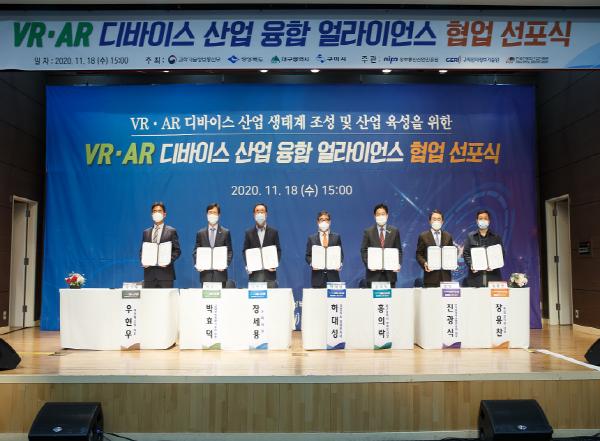 이번 협업 선포식은 지난 4월 과학기술정보통신부 공모사업으로 선정된 「VR·AR 디바이스 개발지원센터 운영」사업을 시작으로, 전기전자·모바일 제조기반을 보유한 경북 구미와 국내 최대 안경산업 기반을 갖춘 대구가 공동 협력을 통하여 VR·AR 디바이스 산업을 선도적으로 이끌어가기 위한 자리로 마련되었다.
