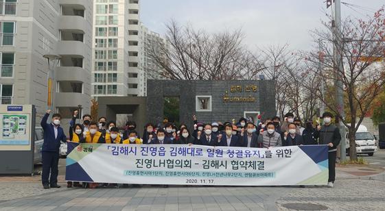 김해시와 진영LH아파트협의회[진영휴먼시아1단지(소장 이호재), 진영휴먼시아6단지(소장 서유식), 진영LH천년나무2단지(소장 박세철), 센텀큐브아파트(소장 강신화)](이하 협의회)는 17일 진영읍 LH아파트 일원 김해대로의 쾌적한 환경 조성을 위해 올바른 생활쓰레기 배출과 자발적 청소 등을 골자로 한 청결유지 협약을 체결했다고 밝혔다.