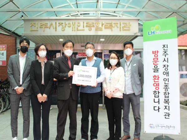 LH한국토지주택공사(사장 변창흠)는 지난 18일, 진주시장애인종합복지관(관장 신동훈)을 찾아 지역 장애인을 위한 후원금 500만원을 전달하여 훈훈한 감동을 주고 있다.