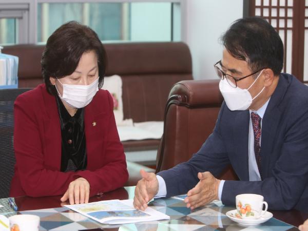 송옥주 국회 환경노동위원장은 장충남 군수의 의견을 경청하며 상임위에서 정부안과 남해군의 의견을 조정해 나가겠다고 약속했다.