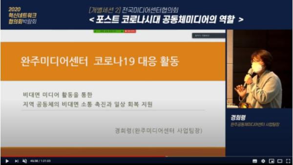 김주영 완주미디어센터센터장은 “여러 미디어 활동을 통해 지역주민들이 온라인으로 더 활발하게 소통할 수 있는 창구를 만들 수 있었다”며 “현재 코로나와 같은 재난상황에 대비해 사업을 탄력적으로 운영할 수 있게 사업을 정비하고 비대면 사업의 확대로 소외된 노인, 장애인 등의 미디어 접근성을 강화하기 위해 대책을 마련하는 중”이라고 밝혔다.