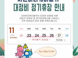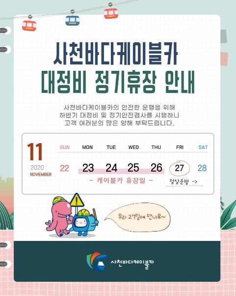 사천시시설관리공단은 사천바다케이블카 하반기 대정비와 정기 안전점검을 위해 오는 11월 23일부터 26일까지 4일간 휴장을 실시한다.