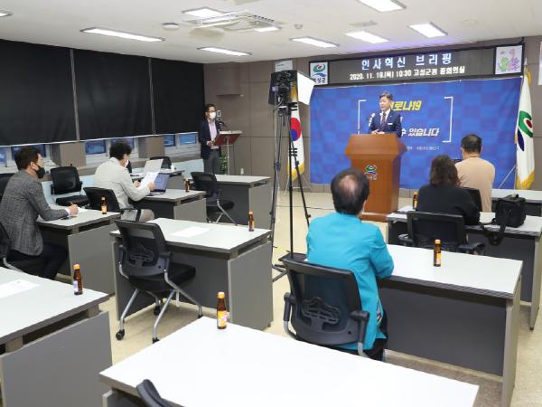 백두현 고성군수는 11월 19일(목) 오전 10시 30분 고성군청 중회의실에서 ‘정책콘테스트’를 개최해 그 결과를 2021년 상반기 정기인사에 반영하는 고성군만의 인사혁신 방안을 발표했다.