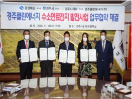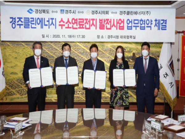 18일 경주시청 대외협력실에서 이철우 경북지사와 주낙영 경주시장, 서호대 경주시의회의장, 임민규 경주클린에너지(주) 대표이사를 비롯해 지역 도·시의원, 관계 공무원 등 20여 명이 참석한 가운데 ‘경주클린에너지 수소연료전지 발전소’의 성공적 투자를 위한 업무협약이 체결됐다.