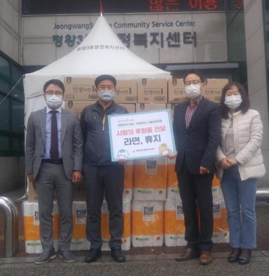 시흥시는 이마트24 본사, 이마트24 시흥새피앙점이 지난 18일 정왕3동 행정복지센터로 라면과 두루마리 휴지 등 60만원 상당의 생필품을 기부했다고 밝혔다.