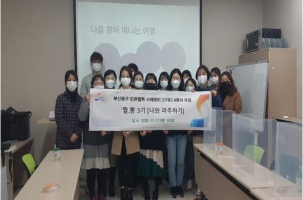 부산광역시 동구는 지난 17일 정신건강복지센터 프로그램실에서 희망복지지원팀을 중심으로 코로나19 시대에도 사회복지현장에서 함께 노력한 행정복지센터 및 민간사회복지관 사례관리실무자 18명의 업무담당자들을 위해 힐링 프로그램을 실시했다.
