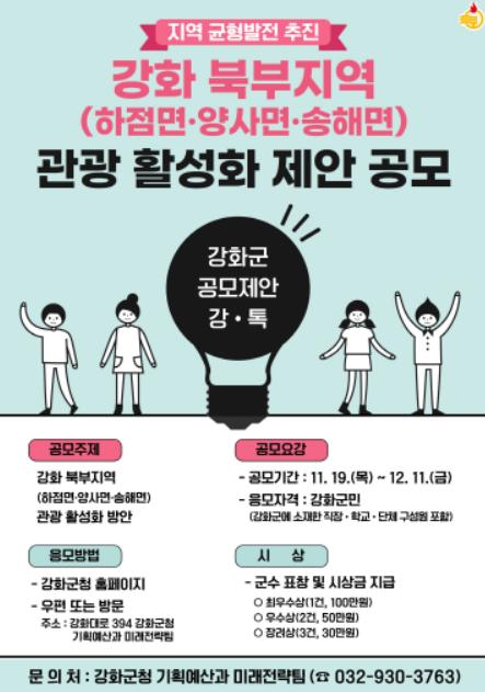 군 관계자는 “강화 북부지역의 경제 활성화와 지역간 균형 발전을 위한 창의적인 아이디어가 다수 응모될 수 있도록 군민들의 적극적인 관심과 참여를 당부드린다”고 말했다.