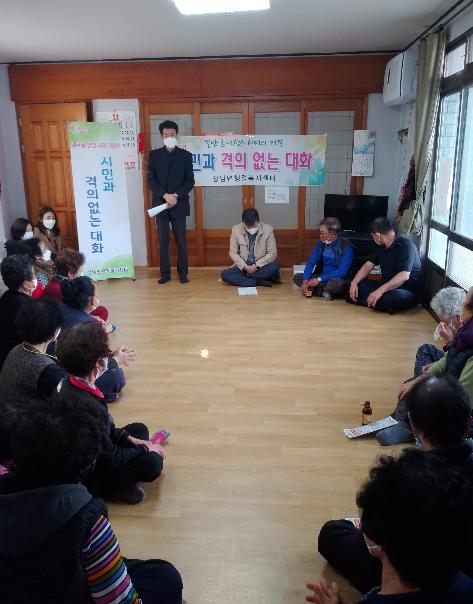 밀양시 상남면은 상남면 행정지도 담당부서인 상하수도과(과장 장용찬)와 함께 18일 지역의 기산경로당에서 마을주민 20여 명과 격의없는 대화의 장을 마련하여 소통의 시간을 가졌다.