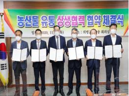 의령군-동화청과(주)-토요애유통(주)-농협중앙회 의령군지부-의령농협-동부 농협이 상호 협력하여 어려움을 겪고 있는 의령군 농산물 유통 상생 협력을 위한 업무협약(MOU)을 체결하였다.