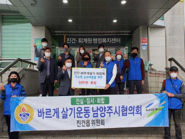 남양주시 진건읍 바르게살기협의회(위원회장 조상희)는 19일 관내 취약계층을 위한 나눔활동에 힘을 보태고자 서부희망케어센터에 후원금 50만원을 전달하였다.