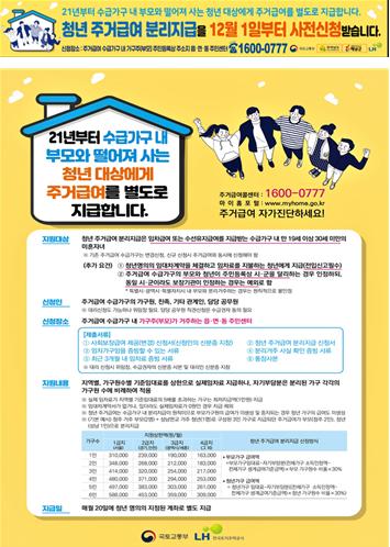 국토교통부는 내년부터 청년 주거급여 분리지급을 시행하고 12월1일부터 사전신청을 받는다고 밝혔다.