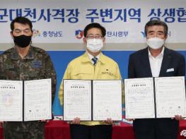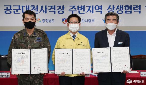 양승조 충남지사는 19일 도청에서 이동원 공군 방공유도탄사령관, 김동일 보령시장과 함께 ‘보령 공군대천사격장 주변지역 상생협력을 위한 합의서’에 서명했다.
