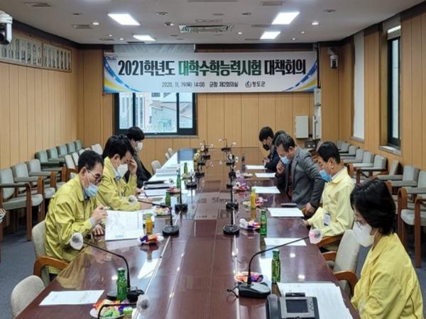 청도군은 지난 19일 군청 제2회의실에서 부서별 관계자 15명이 참석한 가운데 2021학년도 대학수학능력시험 대비 종합대책 관계자 회의를 개최하였다.