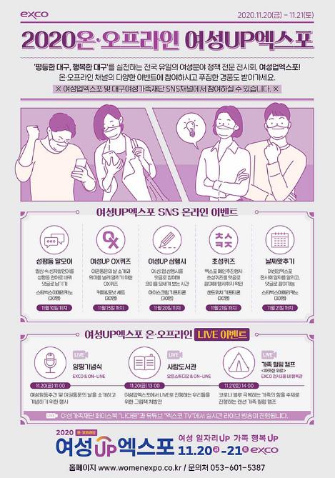 2020 여성UP엑스포와 기념식은 당초 양성평등주간인 9월 4 ~ 5일에 개최할 예정이었으나, 코로나19 확산으로 연기되면서 11월 20 ~ 21일 양일간 엑스코 1층 전시3홀에서 온?오프라인으로 병행해 진행된다.