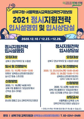 성북청소년미래지원센터 관계자는 “코로나19 장기화와 사회적 거리두기 캠페인에 따른 입시공백을 최소화하고 다가올 2021 정시전형 지원에 도움이 되기를 바란다.”며 관심 있는 학부모와 학생들의 많은 참여를 당부했다.