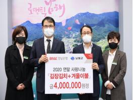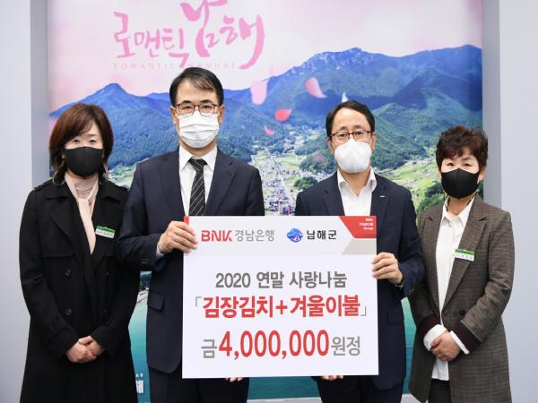 BNK경남은행 남해지점은 19일 남해군청을 방문해 김장김치 67박스와 겨울이불 31채(총 400만원 상당)를 기탁했다.